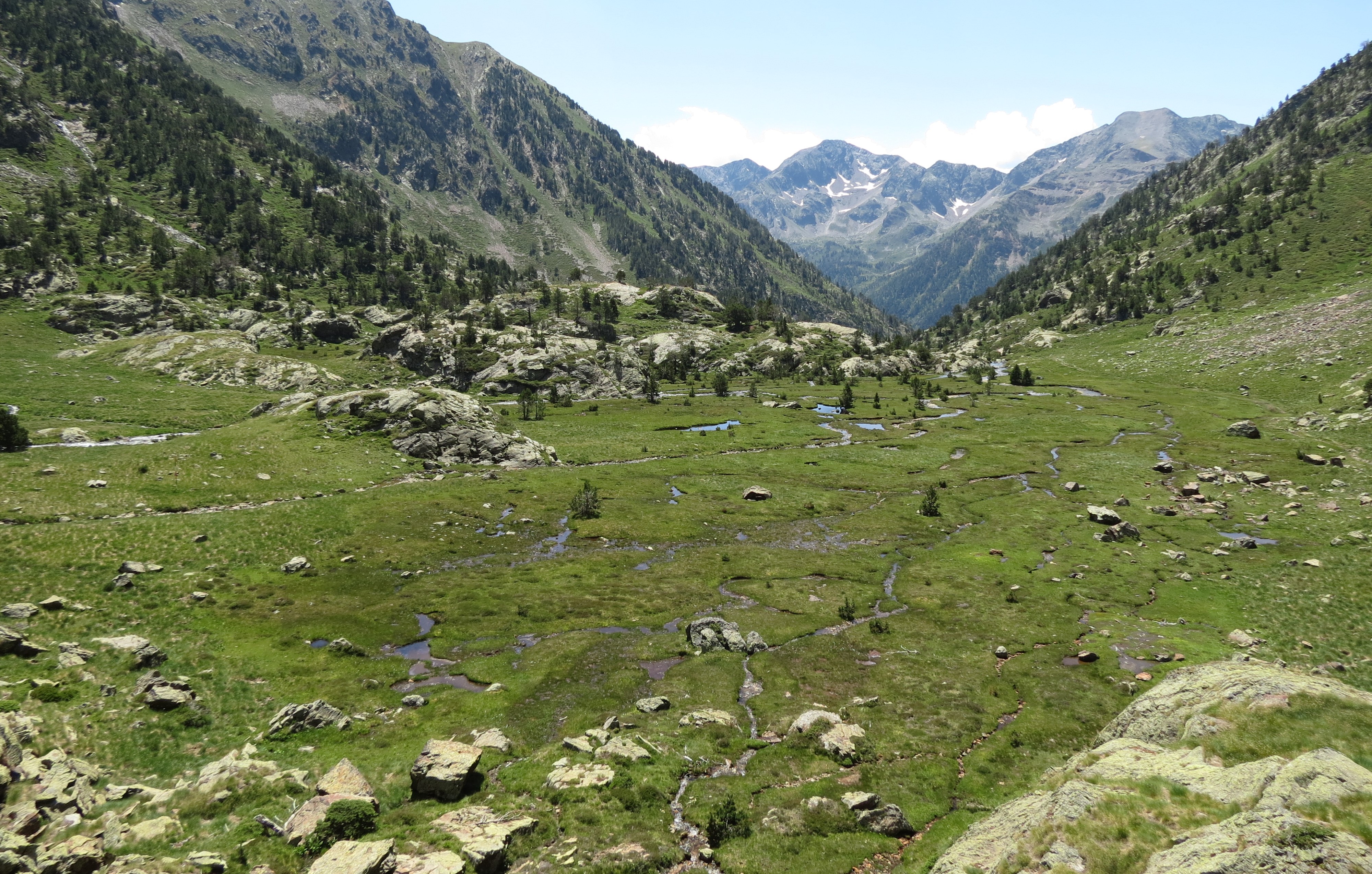 Àrea d’estudi: Pirineus catalans, vessant ibèric (Pallars Sobirà). En concret, el treball se centra en quatre sistemes de mollera relativament complexos, situats a l’estatge subalpí: Pallerols, Rubió, Estanyeres i pla de Sotllo (de 1670 a 2186 m s.m.). A cadascun, s’hi troba un mosaic format per diferents hàbitats, com ara la mollera de Carex nigra, la de Trichophorum cespitosum, la mollera amb C. davalliana o els bonys d’esfagnes.